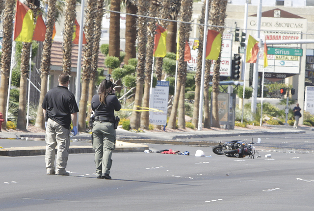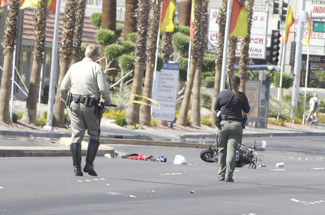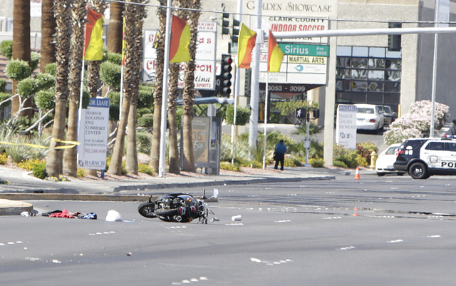 Las Vegas police are investigating a critical crash at West Desert Inn Road and South Valley View Boulevard involving a rider on a possible moped on Wednesday, April 20, 2016. Bizuayehu Tesfaye/Las Vegas Review-Journal Follow @bizutesfaye
