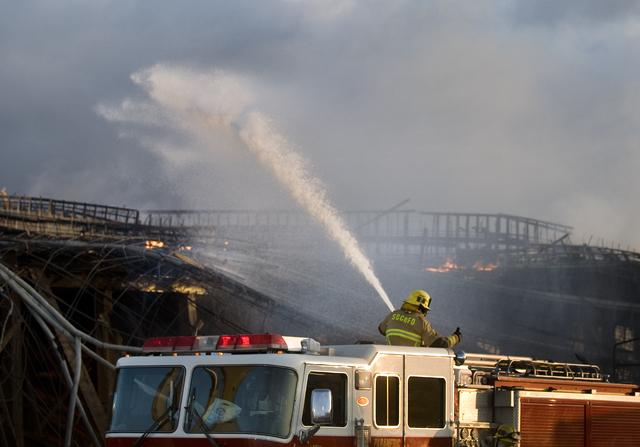 Firefighters try to contain a fire at a bridge construction site on Interstate 15 in Hesperia, Calif., on Tuesday, May 6, 2014. The blaze, which burned through the night, reduced the bridge’s wooden support structure to ash and caused steel girders to sag into the freeway below. Crews used heavy equipment to slowly drag collapsed remnants out of lanes. (AP Photo/The Victor Valley Daily Press, James Quigg)