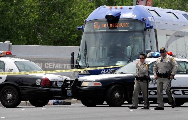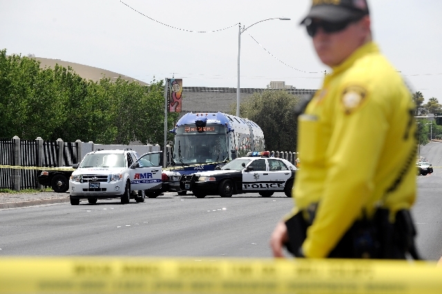 The collision occurred at 11:28 a.m. when a man apparently walked into the path of the bus as it was traveling north on Las Vegas Boulevard, according to police. Witness statements and surveillance video suggest the pedestrian intentionally entered into the path of the bus, according to police.