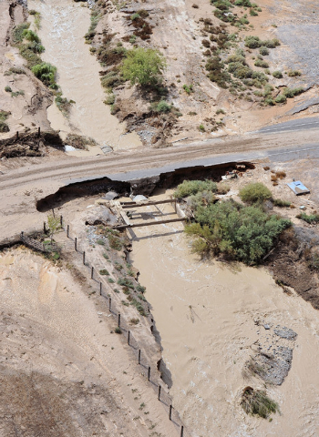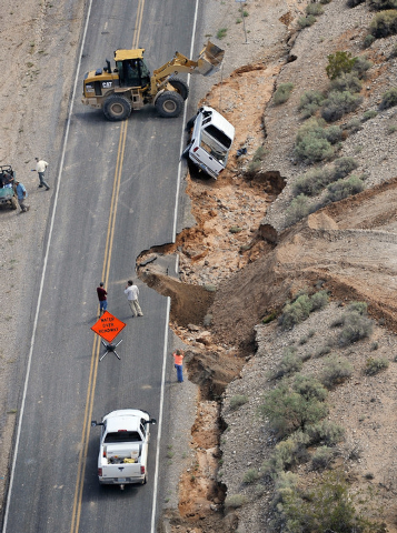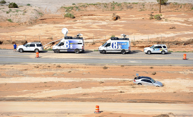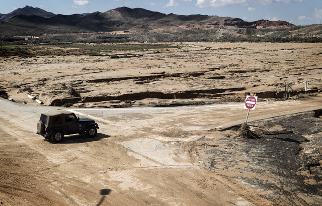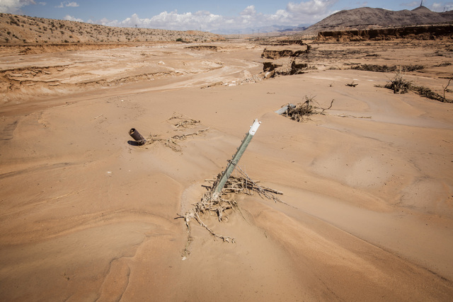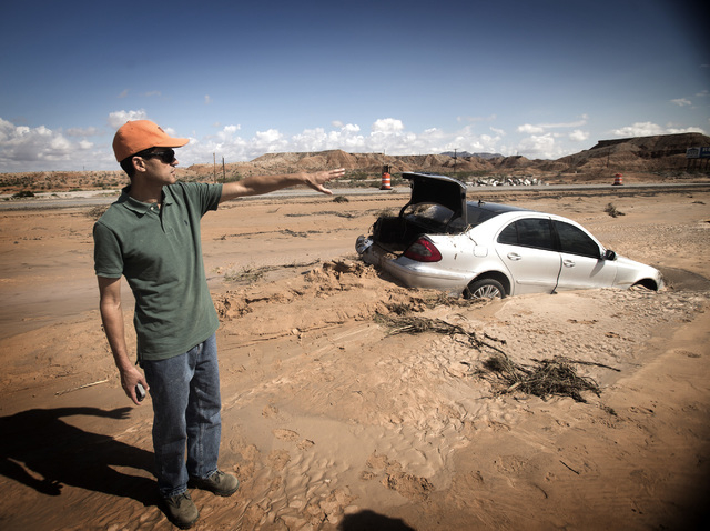 What used to be the median between north and southbound lanes just north of Moapa is now a chasm that is nearly 20 feet deep in spots. Farther south, a Mercedes E350 is buried up to its wheelwells in mud. Just off the road, much of the landscape ravaged by the flood resembles a miniature Grand Canyon.
