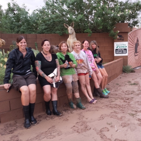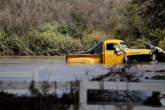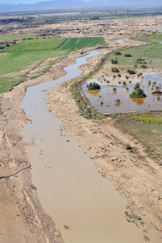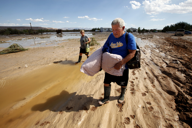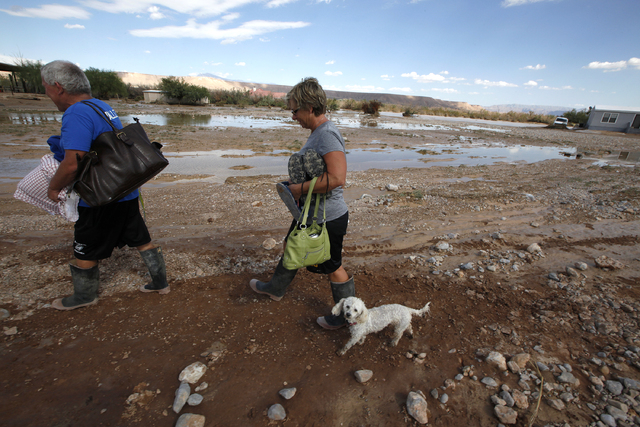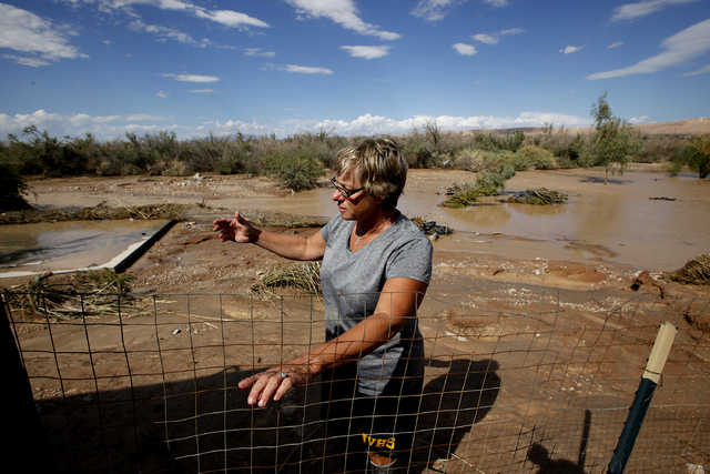 Upstream in the town of Moapa, the owners of the Roos-N-More Zoo and several of their neighbors in low-lying areas saw their yards fill with water Monday, leaving behind a sloppy mess Tuesday. Photos posted to the zoo’s Facebook page showed standing water on much of the property, but all of the animals were safe and accounted for.