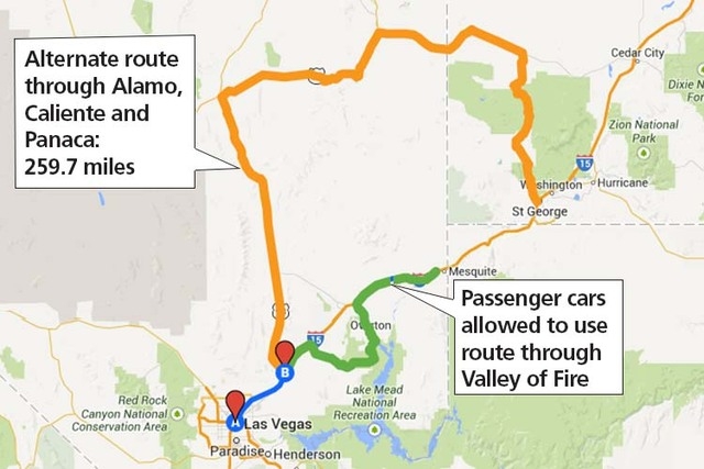 Tractor-trailers will still have to use the longer detour through Lincoln County. That route diverts northbound I-15 traffic from Las Vegas onto U.S. Highway 93 and north from there all the way to the town of Panaca, then east on state Route 319, which becomes Utah Route 56 and connects to I-15 at Cedar City.