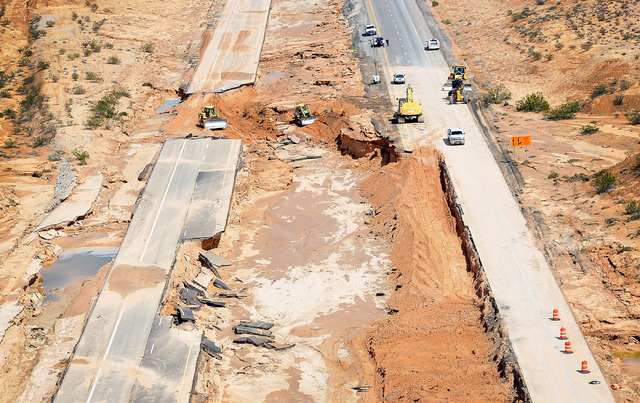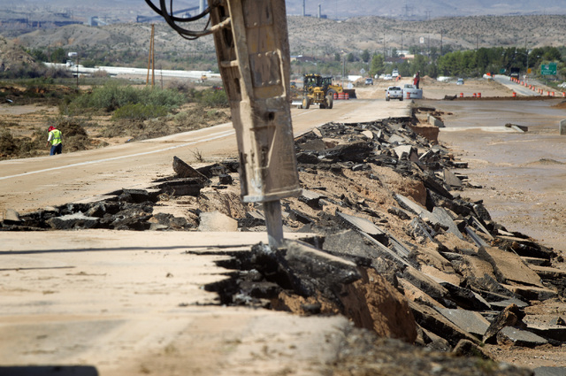 Several portions of I-15 north of Moapa were ripped away by floodwaters that tore through Southern Nevada on Monday afternoon during a once-in-a-century storm, rendering several parts of the freeway impassable to traffic.