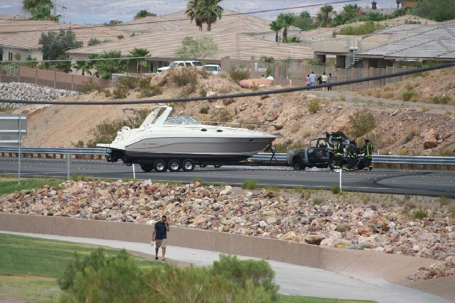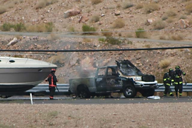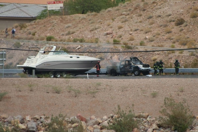 A truck pulling a boat on a trailer caught fire, which caused the truck to separate from the trailer.