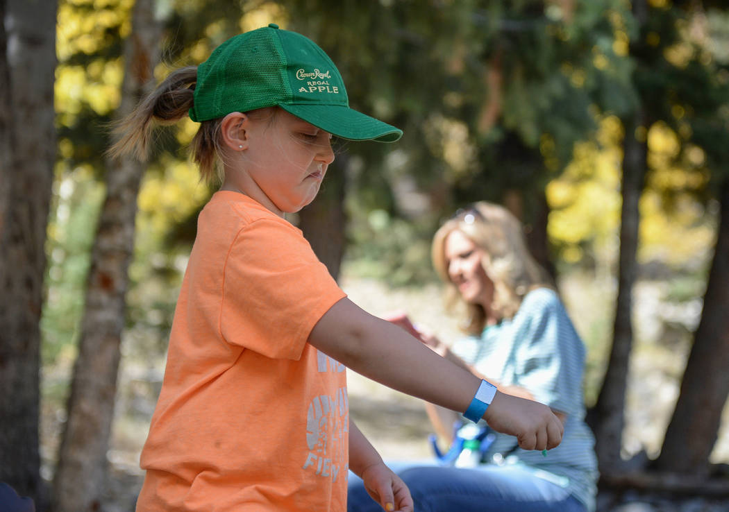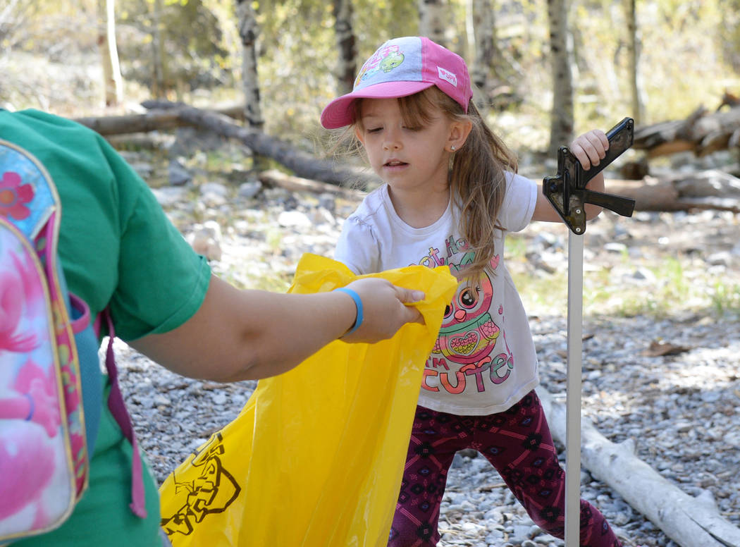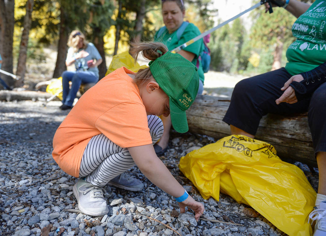 Jenna Harris, 5, from Girl Scout Troop 518 places up a piece of trash off the ground into a garbage bag while participating in the litter collection as a part of the volunteer program called "Green the Mountain" put on by the Go Mt Charleston Team in Mount Charleston, Saturday, Sept. 29, 2018. Caroline Brehman/Las Vegas Review-Journal