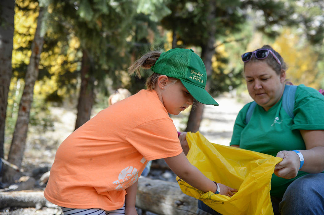 Mother and daughter Leanna Kromer, left, and Elizabeth Kromer, 11, of Henderson pick up pieces of trash found along the Fletcher Canyon trail while participating in the litter collection as a part of the volunteer program called "Green the Mountain" put on by the Go Mt Charleston Team in Mount Charleston, Saturday, Sept. 29, 2018. Caroline Brehman/Las Vegas Review-Journal