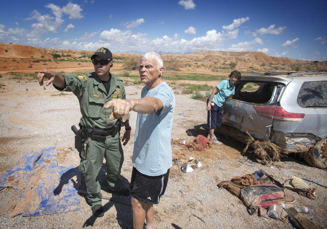 The Millers weren’t the only ones to lose property in Monday’s torrential rains, which dumped up to 4 inches in some parts of Clark County. The system was pushed north by remnants of Hurricane Norbert, which also flooded Phoenix and other parts of Arizona. A nearly 20-mile stretch of I-15 in northeast Clark County, including the spot where the Millers were swept away, is closed after sections of the freeway caved in.
