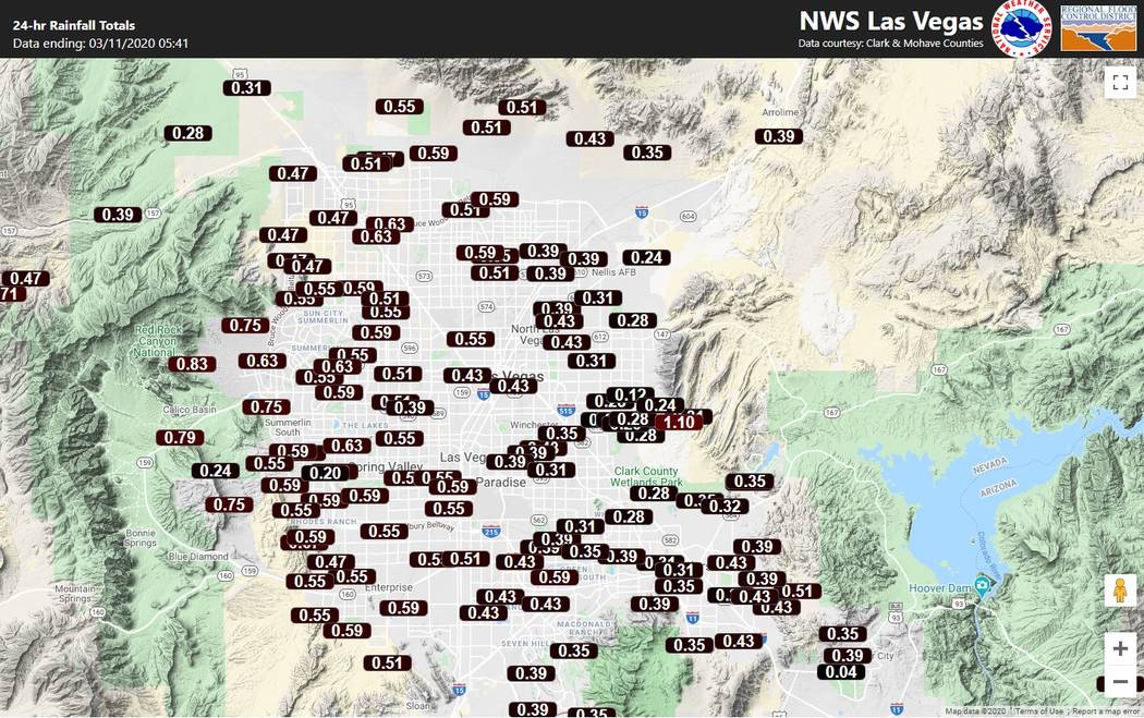 McCarran International Airport had received 0.54 inches of rain since through 4 a.m. Wednesday since the moisture began falling early Tuesday. A record 0.45 inches fell in the 24 hours ending at midnight Tuesday, surpassing 0.29 that fell on March 10, 1969.