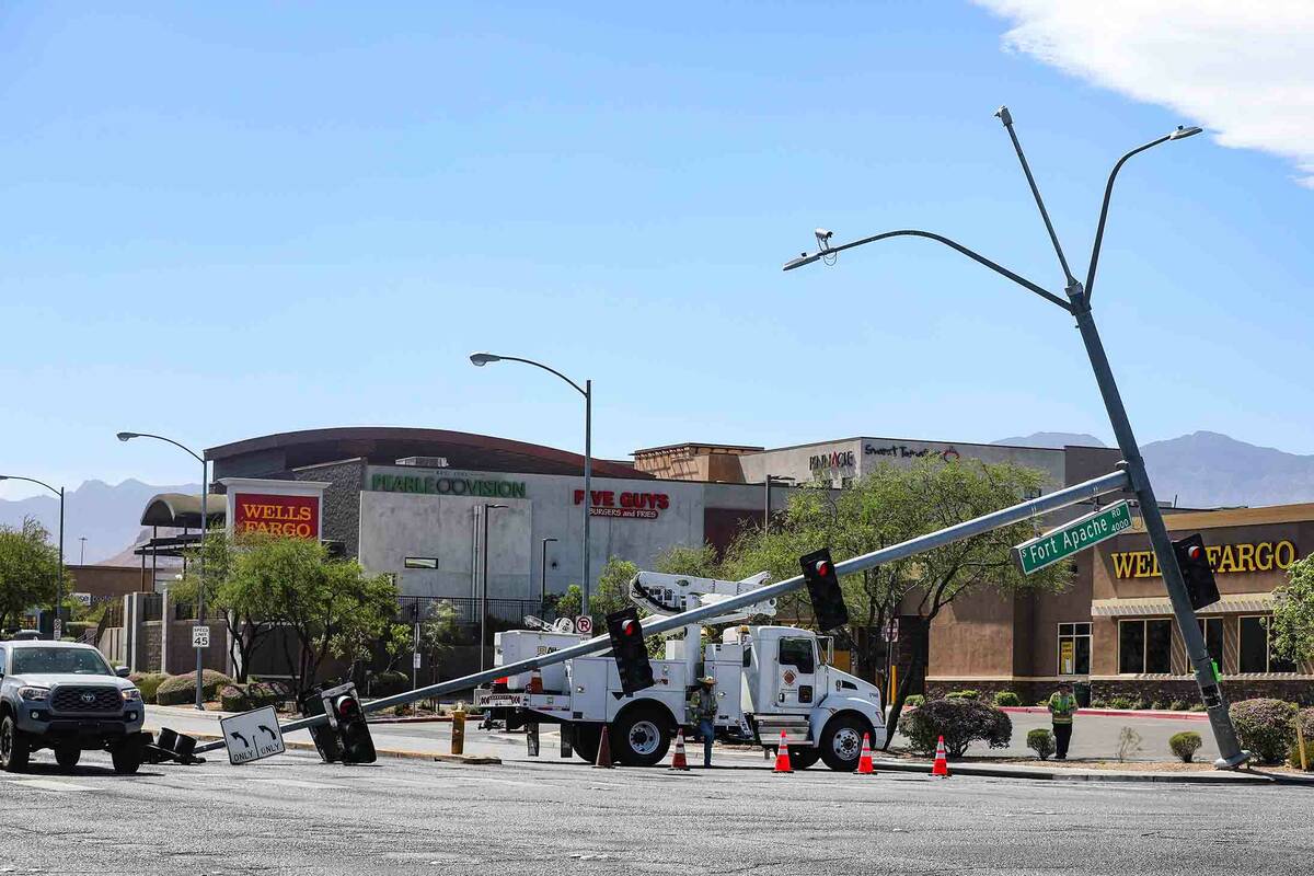 A traffic control signal at Fort Apache and Flamingo roads was down over the intersection with the lighting element on the pavement blocking a turn lane.