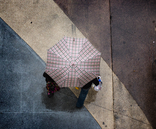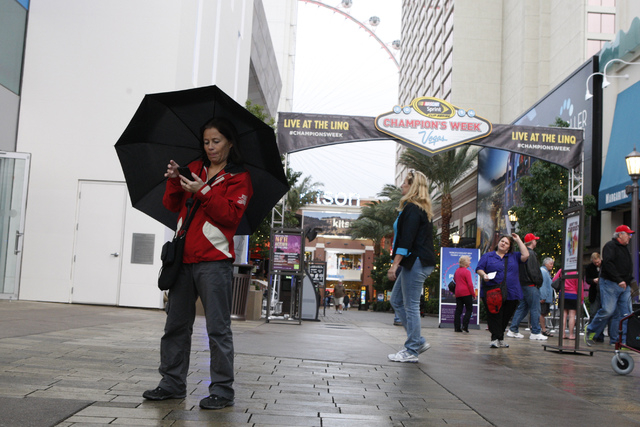 Hege Austvoll, a tourist from Norway, takes cover from the rain under her umbrella near The Linq in Las Vegas Tuesday, Dec. 2, 2014. (Erik Verduzco/Las Vegas Review-Journal)