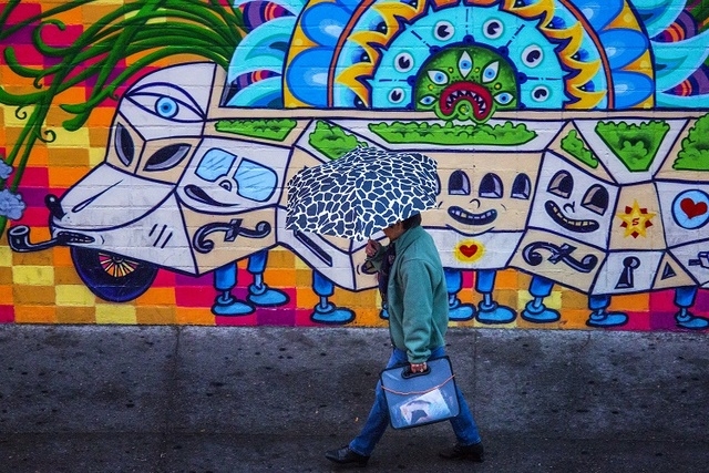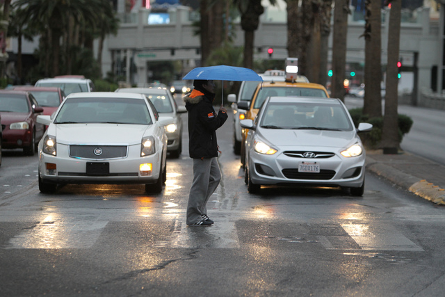 An unidentified walks across Las Vegas Boulevard with his umbrella near The Linq in Las Vegas Tuesday, Dec. 2, 2014. (Erik Verduzco/Las Vegas Review-Journal)