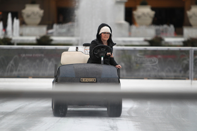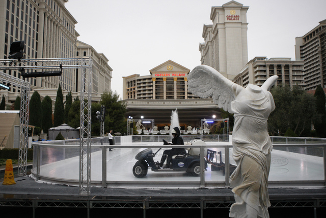 Employees work on the ice rink near Caesars Palace casino-hotel in Las Vegas Tuesday, Dec. 2, 2014. (Erik Verduzco/Las Vegas Review-Journal)