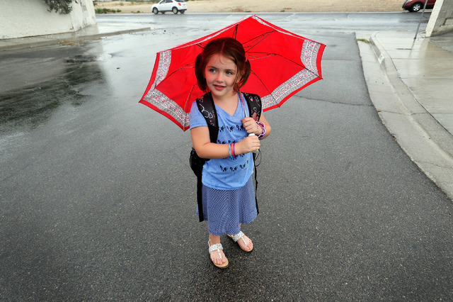 Madison Matthews, 6, walks home in the rain after school on Monday, Sept. 8, 2014. The first grader was met by her mother and sister at the bus and walked home together. (Photo by David Becker/Las Vegas Review-Journal)