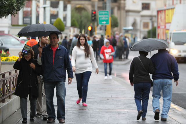 A man walks along Las Vegas Boulevard near Fremont Street on Tuesday, Dec. 02, 2014. The forecast calls for rain in the Las Vegas valley through Thursday afternoon.(Jeff Scheid/Las Vegas Review-Journal)