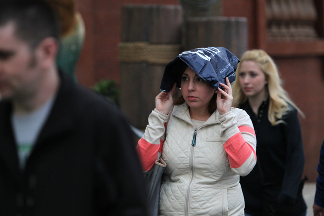 A woman who refused to give her name covers herself from the rain as she walks down the Strip near The Linq in Las Vegas Tuesday, Dec. 2, 2014. (Erik Verduzco/Las Vegas Review-Journal)