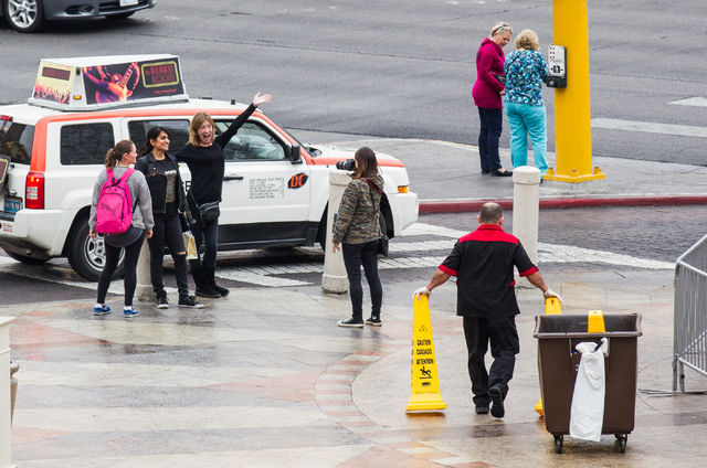 A janitor looks to put up warning signs as rain lightly falls outside of the Venetian hotel-casino in Las Vegas on Tuesday, Dec. 2, 2014. (Chase Stevens/Las Vegas Review-Journal)