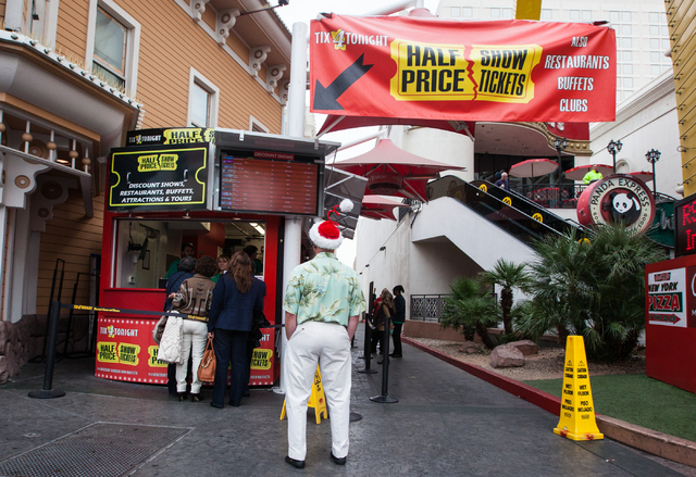 People wait in line for discounted show tickets as a warning sign is posted on the ground due to intermittent rain in Las Vegas on Tuesday, Dec. 2, 2014. (Chase Stevens/Las Vegas Review-Journal)