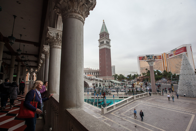 People look out at the Strip from the Venetian hotel-casino as clouds loom overhead in Las Vegas on Tuesday, Dec. 2, 2014. (Chase Stevens/Las Vegas Review-Journal)
