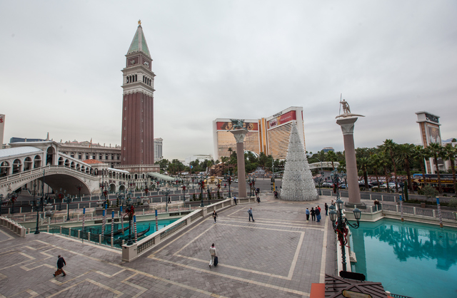 A man dressed as Elvis, lower center, walks across a bridge at the Venetian hotel-casino along the Strip as clouds loom overhead in Las Vegas on Tuesday, Dec. 2, 2014. (Chase Stevens/Las Vegas Review-Journal)