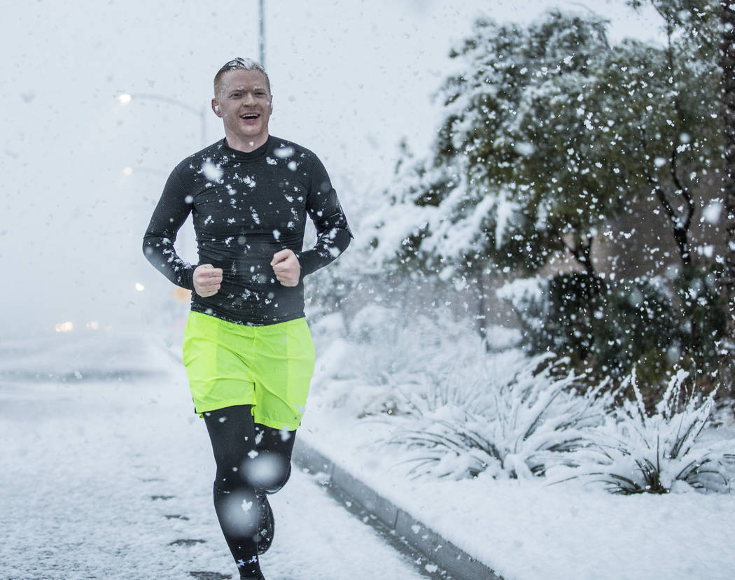 Josh Perkins embraced the elements Thursday by taking a run through heavy snow on West Centennial Parkway. “It’s awesome out here,” said Perkins, who sported a long-sleeve shirt and neon yellow shorts over running tights.