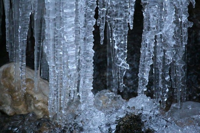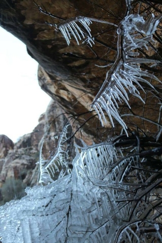 Ice encases the end of a branches below a dripping waterfall near the Children’s Discovery Trail in Red Rock Friday, Dec., 26, 2014. (Mark Anton/Las Vegas Review-Journal)