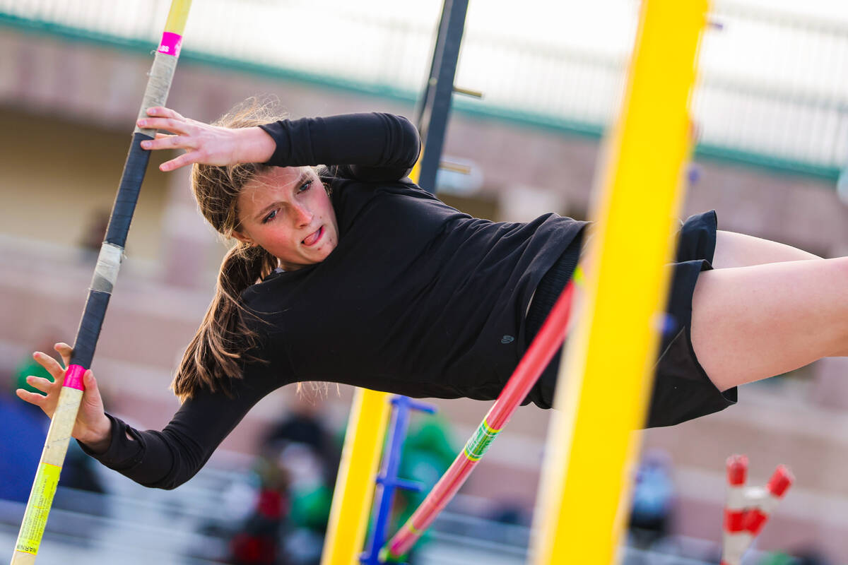 A pole vaulter competes during a high school track and field meet at Palo Verde High School Friday, March 14, 2025, in Las Vegas. (Madeline Carter/Las Vegas Review-Journal)