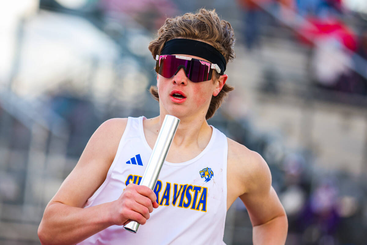A Sierra Vista competitor runs during a high school track and field meet at Palo Verde High School Friday, March 14, 2025, in Las Vegas. (Madeline Carter/Las Vegas Review-Journal)