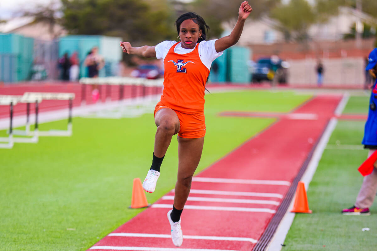 Legacy triple jumper JayAnna Rabon leaps into the air during a high school track and field meet at Palo Verde High School Friday, March 14, 2025, in Las Vegas. (Madeline Carter/Las Vegas Review-Journal)