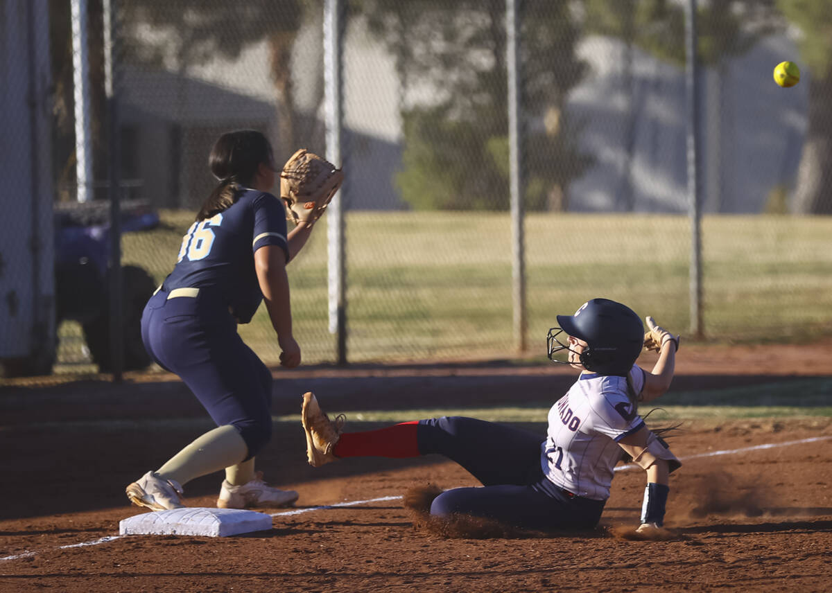 Coronado's Charlotte Bendlin (21) gets to third base against Foothill's Isabella Higuera (96) during a softball game at Coronado High School on Tuesday, March 4, 2025, in Henderson. (Chase Stevens/Las Vegas Review-Journal) @csstevensphoto