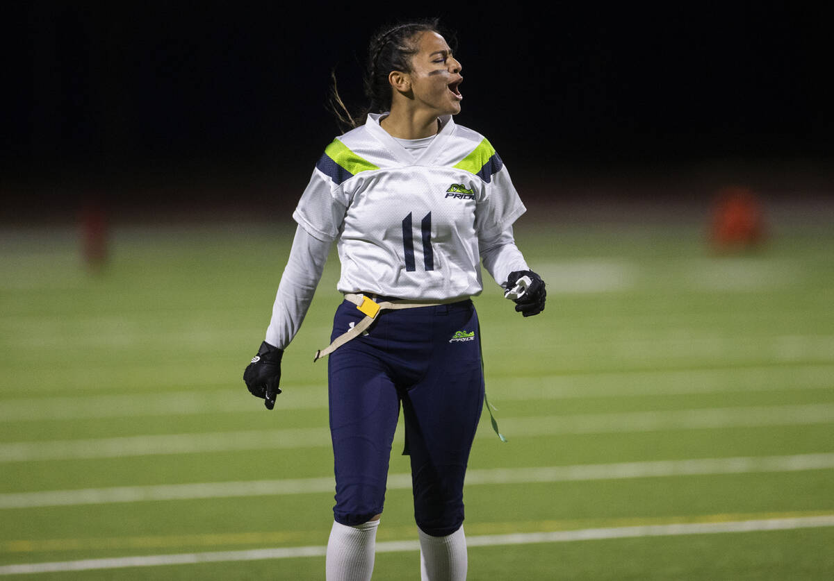 As Shadow Ridge flag football coach Matthew Nighswonger congratulated his team in the postgame huddle, he called up Mikayla Brown to be recognized.