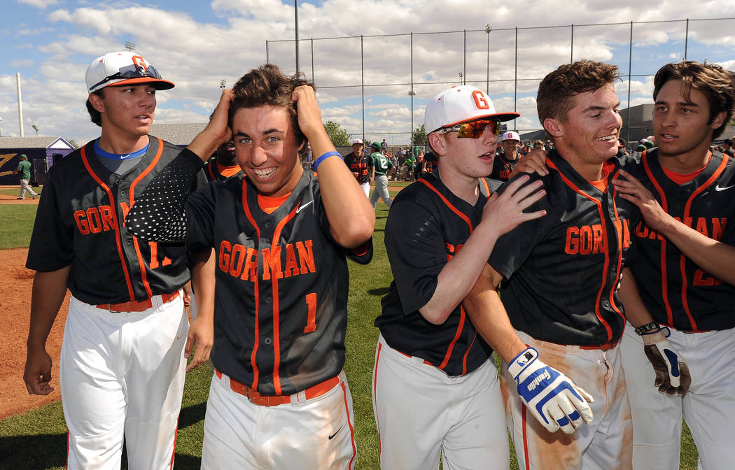 Bishop Gorman players celebrate with Cadyn Grenier, right, blue batting gloves, after he hit a walk-off home run in the ninth inning of the NIAA Division I State championship baseball game against Green Valley at Durango High School in Las Vegas Saturday May 16, 2015. Bishop Gorman defeated Green Valley 6-5. (Josh Holmberg/Las Vegas Review-Journal)