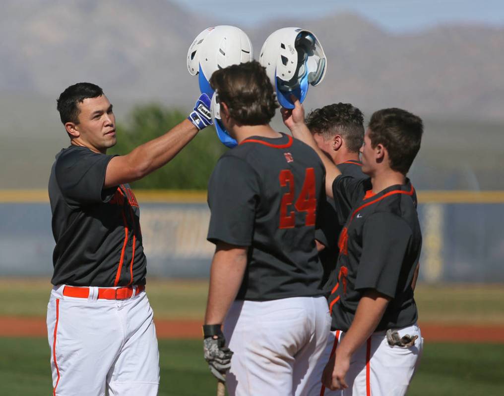 Bishop Gorman’s Cadyn Grenier (2) is congratulated by teammate Noah Serrano (6) after hitting a home run during their baseball game played against Liberty High at the Bishop Gorman baseball field in Las Vegas on Saturday Mar. 14, 2015. Bishop Gorman won 4-2. (Martin S. Fuentes/Las Vegas Review-Journal)