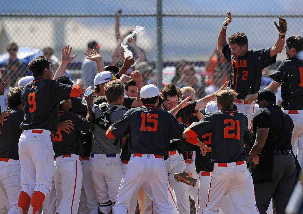 Bishop Gorman players celebrate with Cadyn Grenier, left, after he hit a walk-off home run in the ninth inning of the NIAA Division I State championship baseball game against Green Valley at Durango High School in Las Vegas Saturday May 16, 2015. Bishop Gorman defeated Green Valley 6-5. (Josh Holmberg/Las Vegas Review-Journal)