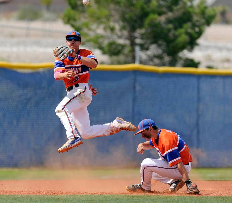 Bishop Gorman shortstop Cadyn Grenier makes an acrobatic throw over third baseman Beau Capanna in attempt to throw out Centennial’s Josh McKibbinn in the sixth inning of the Sunset Region Championship game On Saturday. McKibbin got an infield single on the play. Centennial beat the Gaels 3-1 to claim the title. (Josh Holmberg/Las Vegas Review Journal)