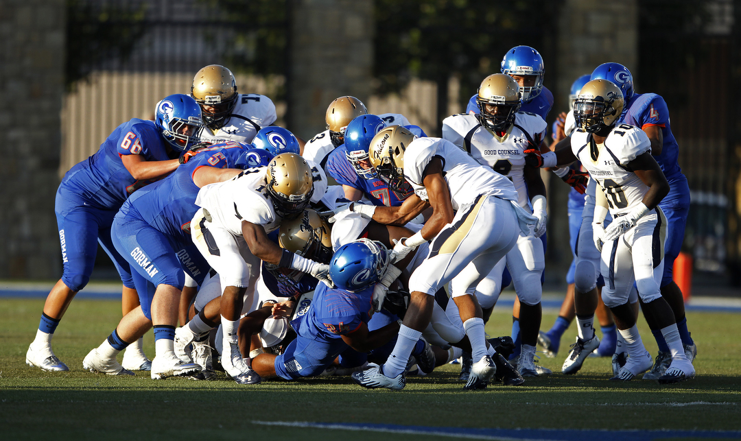 Nathan Starks, bottom center, of Bishop Gorman High School gets tackled by Our Lady of Good Counsel High School at Bishop Gorman in Las Vegas Friday, Aug. 24, 2012. (David Cleveland/Las Vegas Review-Journal)