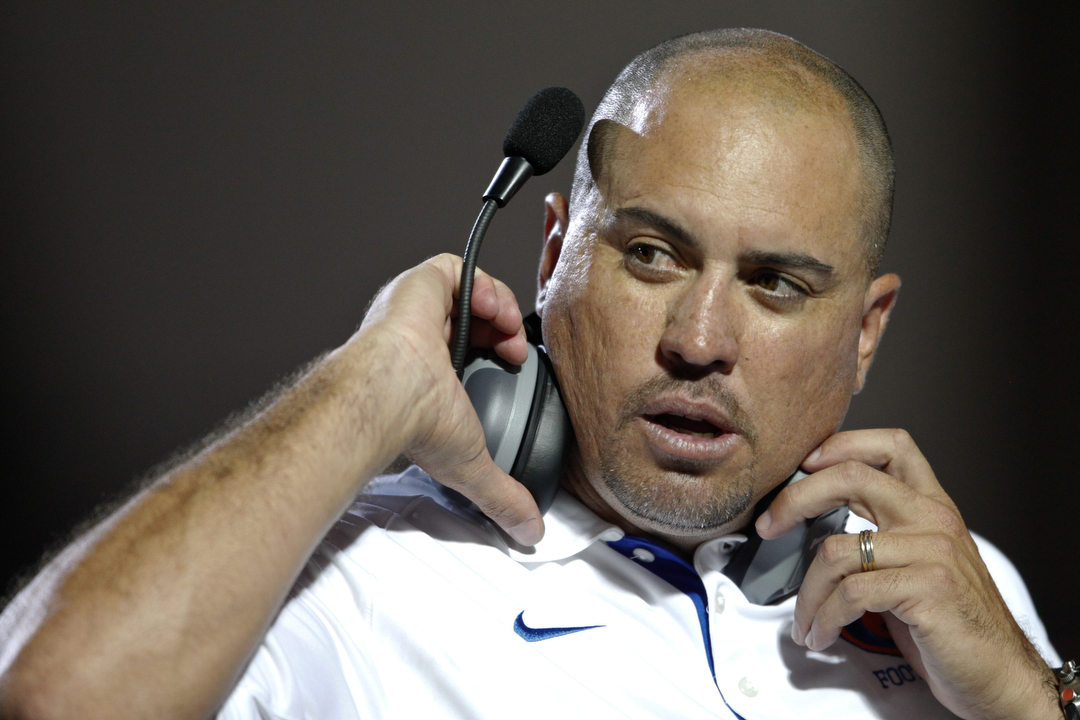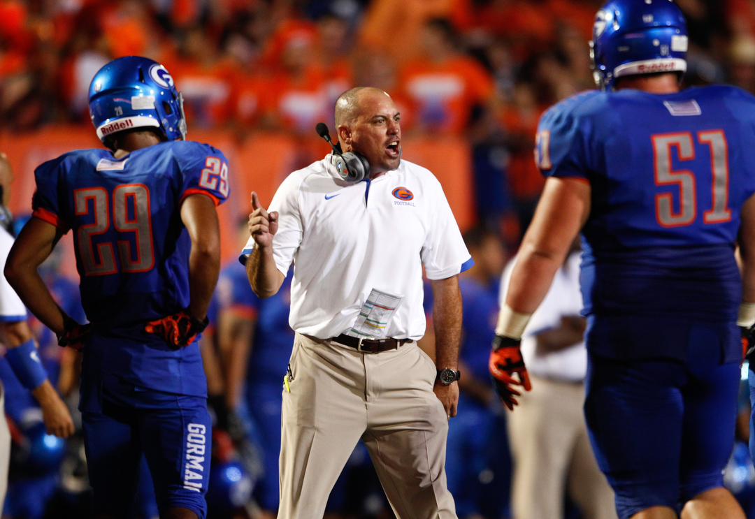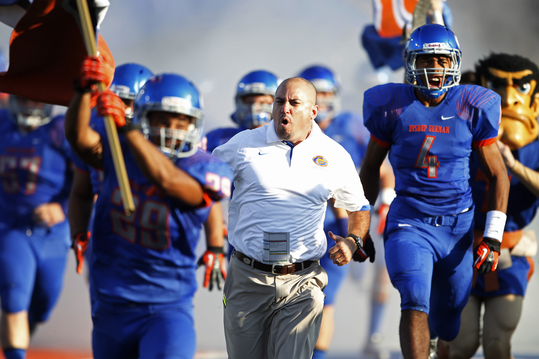 Bishop Gorman High School head coach Tony Sanchez runs on to the field before playing Our Lady of Good Counsel High School at Bishop Gorman in Las Vegas Friday, Aug. 24, 2012. (David Cleveland/Las Vegas Review-Journal)