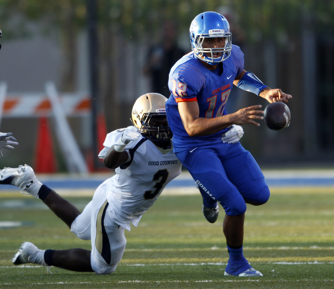 Darien Carr of Our Lady of Good Counsel High School forces Bishop Gorman quarterback Jarrett Solomon to fumble during their game at Bishop Gorman in Las Vegas Friday, Aug. 24, 2012. (David Cleveland/Las Vegas Review-Journal)