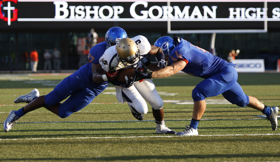 Robert Stanley, left, and Nikolas Stonestreet, right, of Bishop Gorman High School tackle Kendall Fuller of Our Lady of Good Counsel High School at Bishop Gorman in Las Vegas Friday, Aug. 24, 2012. (David Cleveland/Las Vegas Review-Journal)