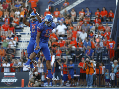 Quarterback Jarrett Solomon, right, of Bishop Gorman High School celebrates with teammate Tajon Smith after Solomon scored a touchdown against Our Lady of Good Counsel High School at Bishop Gorman in Las Vegas Friday, Aug. 24, 2012. (David Cleveland/Las Vegas Review-Journal)