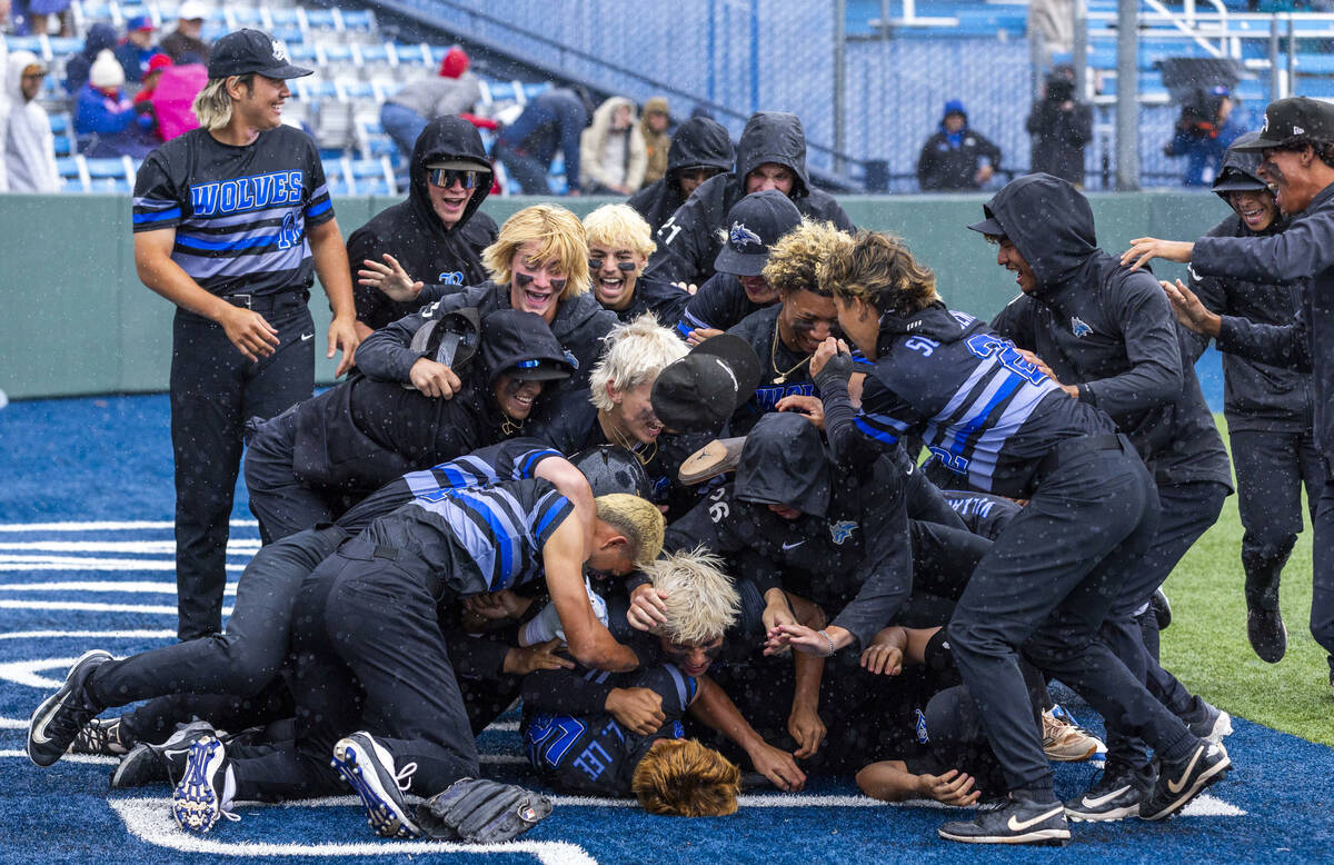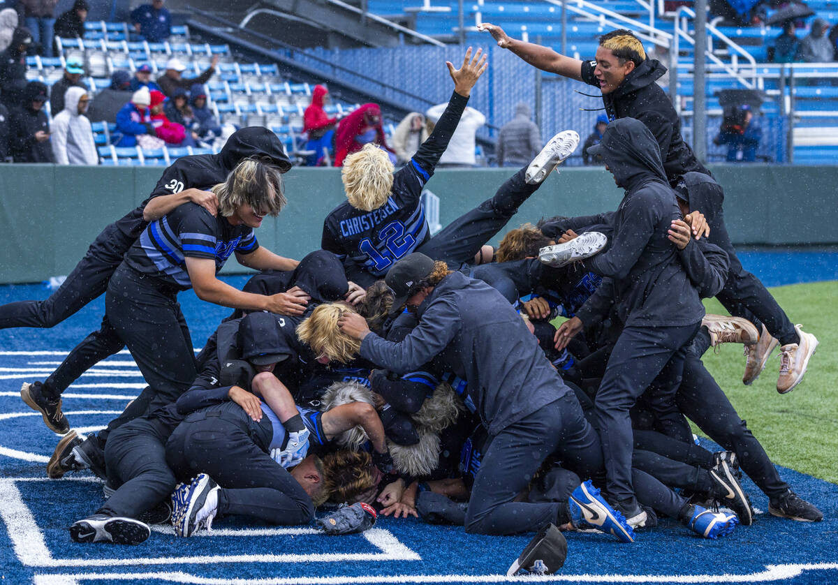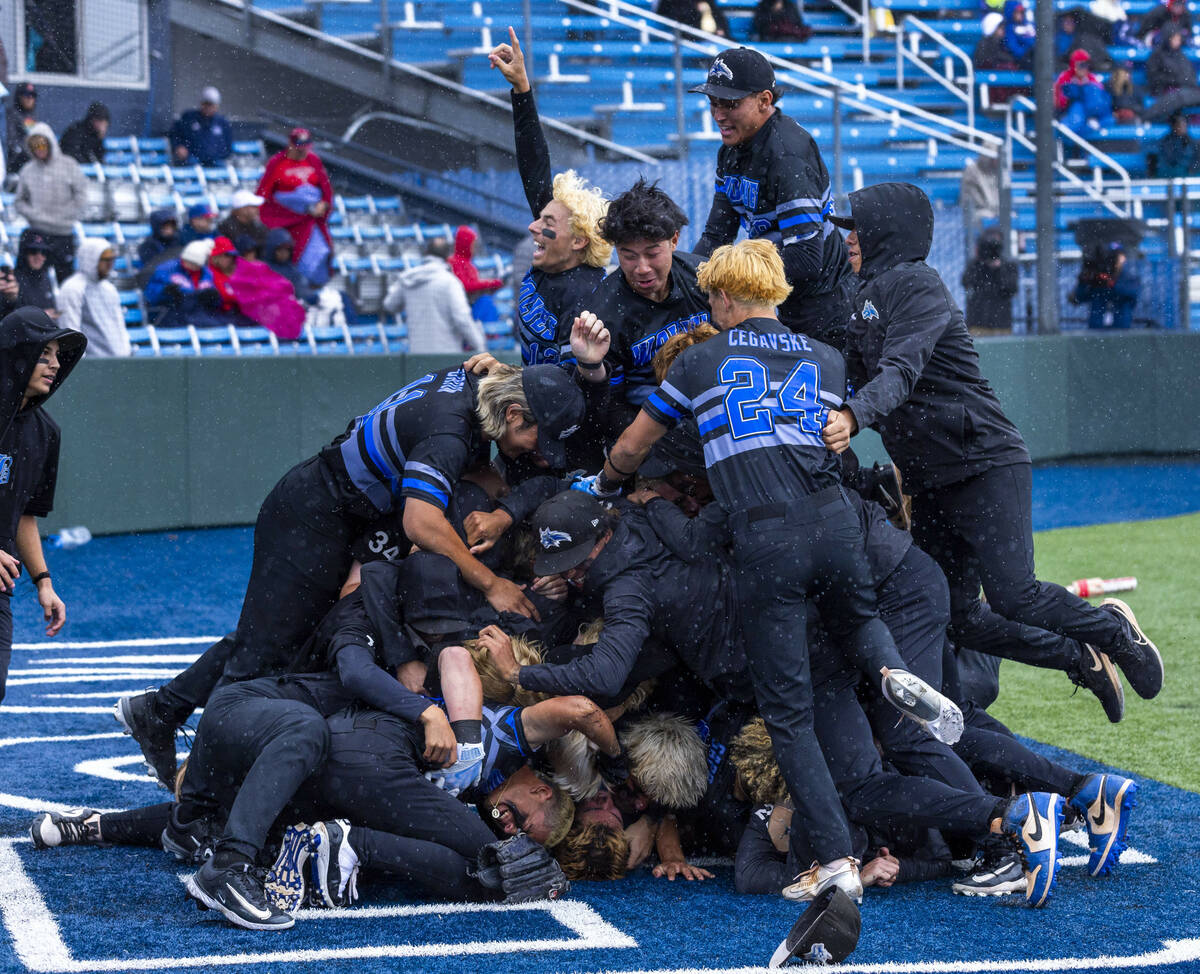 Basic overcame a deficit for its second straight game of the state tournament and a rainy day — which included a lightning delay of nearly 40 minutes — to win the Class 5A state title with a 3-2 eight-inning win over Reno High at UNR’s Peccole Park on a walk-off bases-loaded wild pitch.