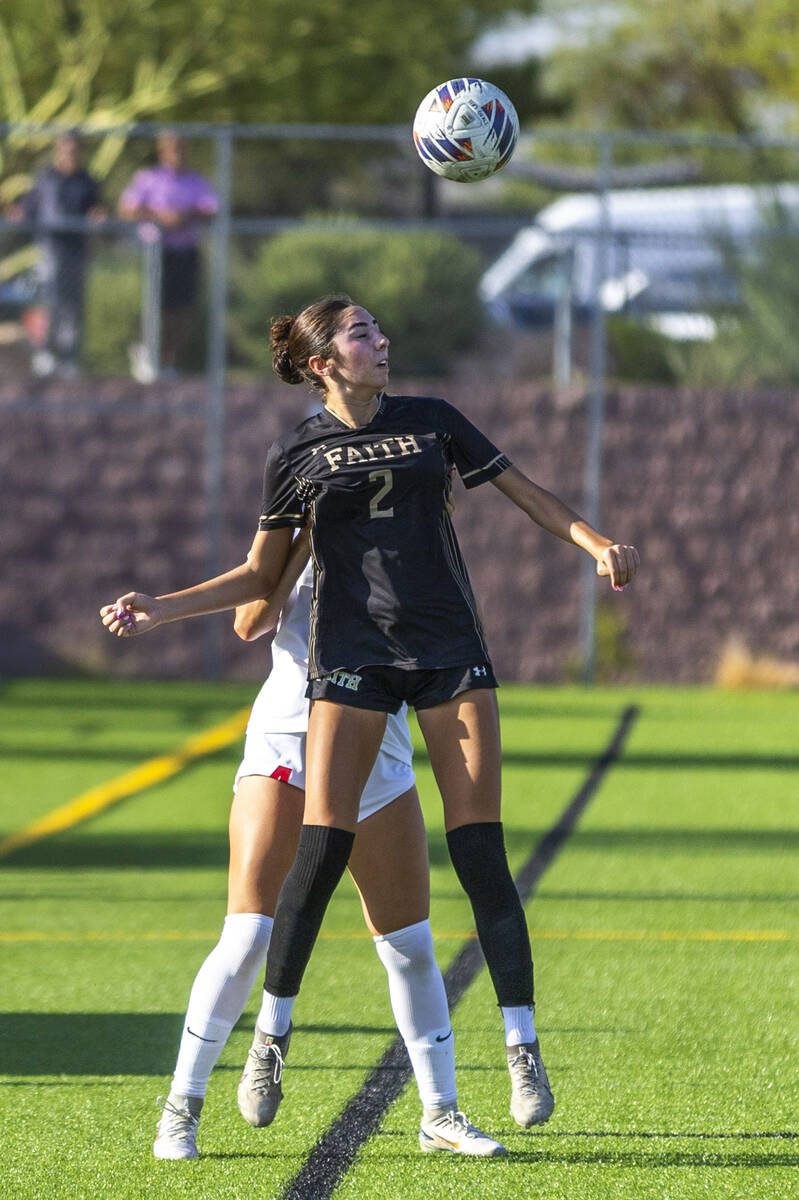 Coronado Faith Lutheran forward Elliott Lujan (2) heads the ball ahead of Coronado defender Ella Schultz (4) during the second half of their NIAA girls soccer game on Tuesday, August 26, 2025, in Las Vegas. (L.E. Baskow/Las Vegas Review-Journal) @Left_Eye_Images