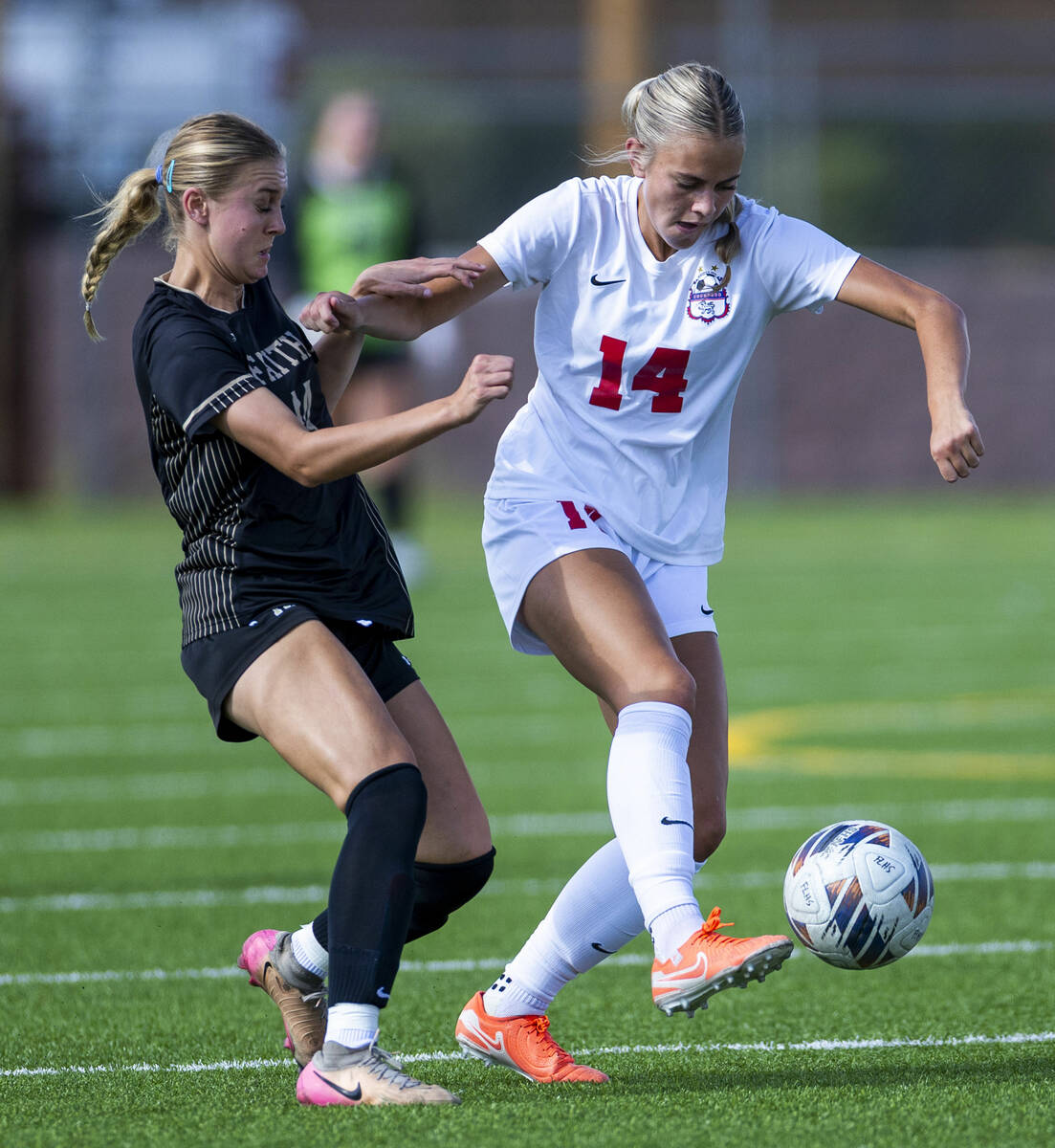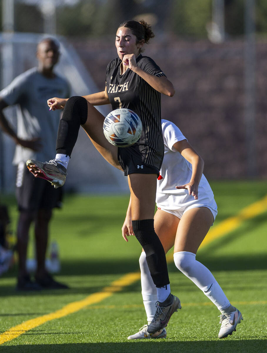 Coronado midfielder Allison Kleiner (14) controls the ball against Faith Lutheran defender Addison Jarvis (18) during the second half of their NIAA girls soccer game on Tuesday, August 26, 2025, in Las Vegas. (L.E. Baskow/Las Vegas Review-Journal) @Left_Eye_Images