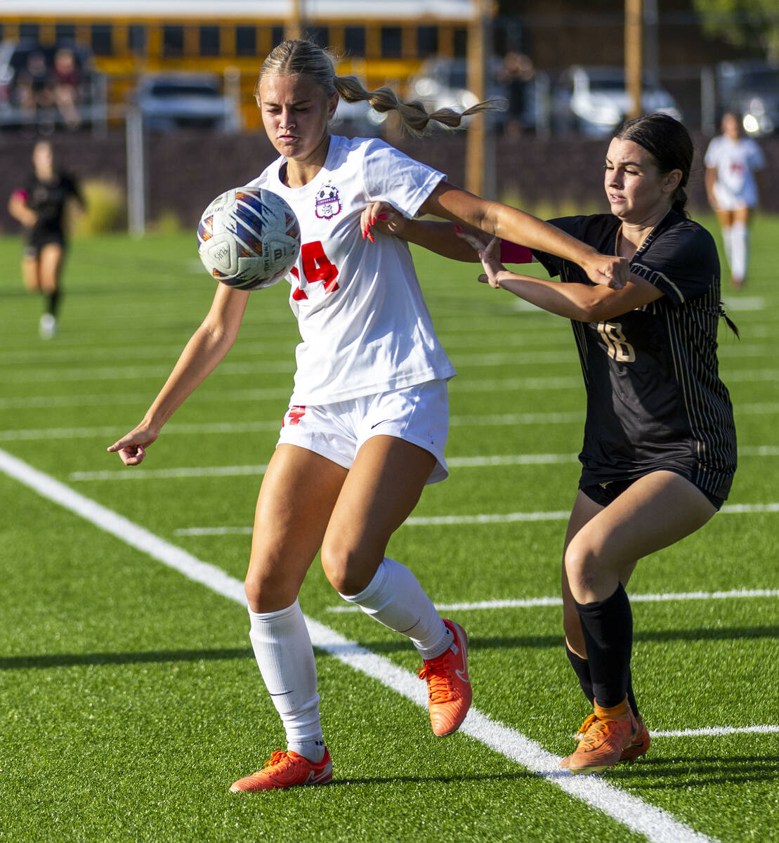Coronado Faith Lutheran forward Elliott Lujan (2) secures the ball against Coronado defender Ella Schultz (4) during the second half of their NIAA girls soccer game on Tuesday, August 26, 2025, in Las Vegas. (L.E. Baskow/Las Vegas Review-Journal) @Left_Eye_Images