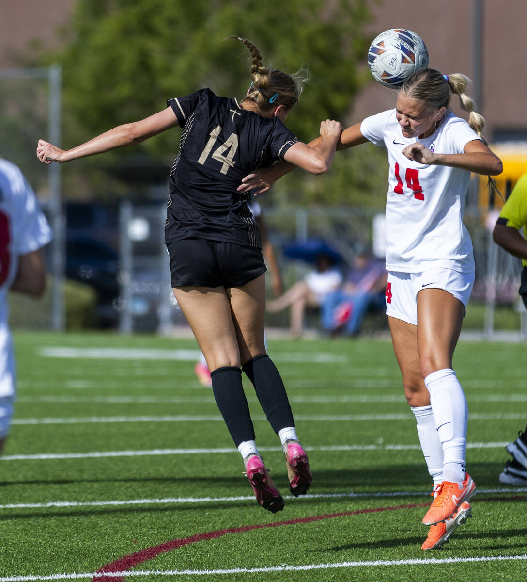 Faith Lutheran defender Kloe Abdalla (14) and Coronado midfielder Allison Kleiner (14) attempt to control a header while advancing the ball during the first half of their NIAA girls soccer game on Tuesday, August 26, 2025, in Las Vegas. (L.E. Baskow/Las Vegas Review-Journal) @Left_Eye_Images
