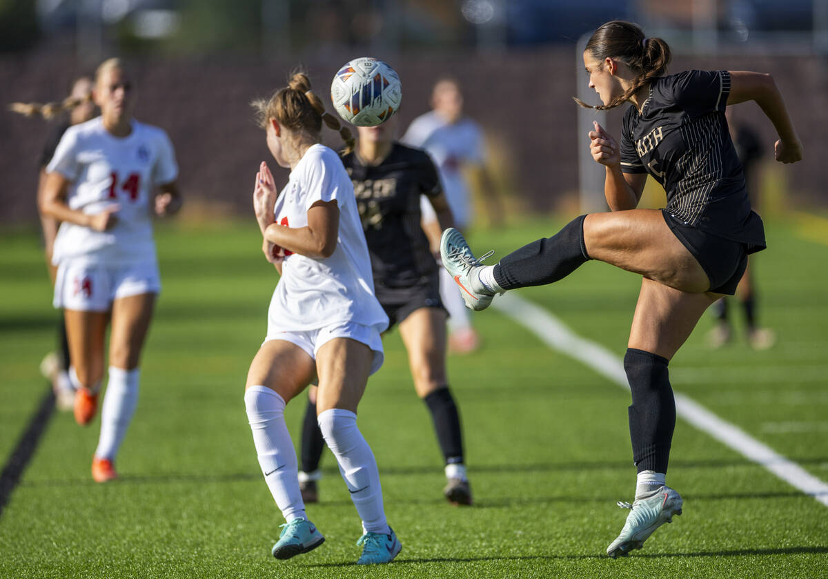 Faith Lutheran defender Posie Armstrong (5) kicks the ball past a Coronado defender during the second half of their NIAA girls soccer game on Tuesday, August 26, 2025, in Las Vegas. (L.E. Baskow/Las Vegas Review-Journal) @Left_Eye_Images