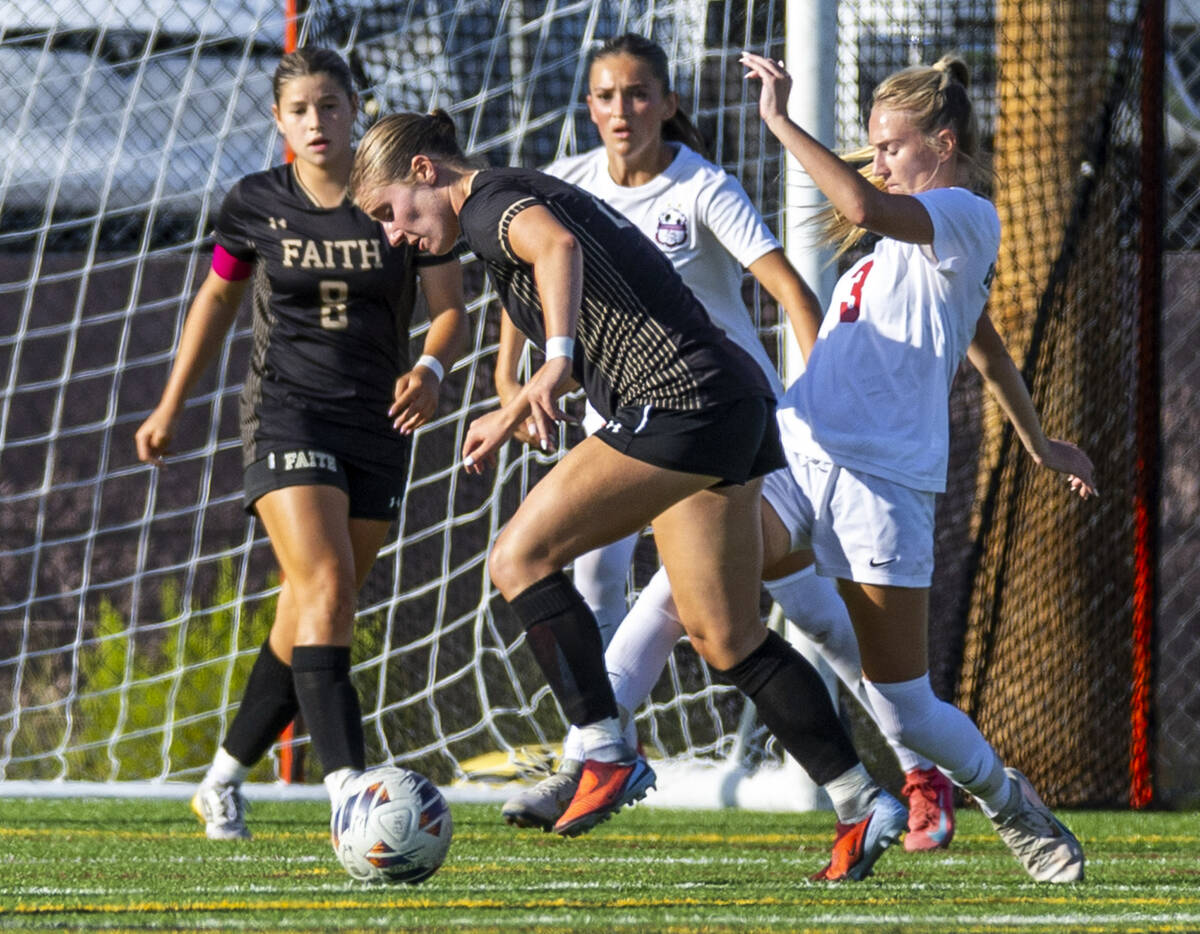 Faith Lutheran defender Posie Armstrong (5) looks to the ball while battling Coronado defender Ella Schultz (4) and midfielder Allison Kleiner (14) during the second half of their NIAA girls soccer game on Tuesday, August 26, 2025, in Las Vegas. (L.E. Baskow/Las Vegas Review-Journal) @Left_Eye_Images