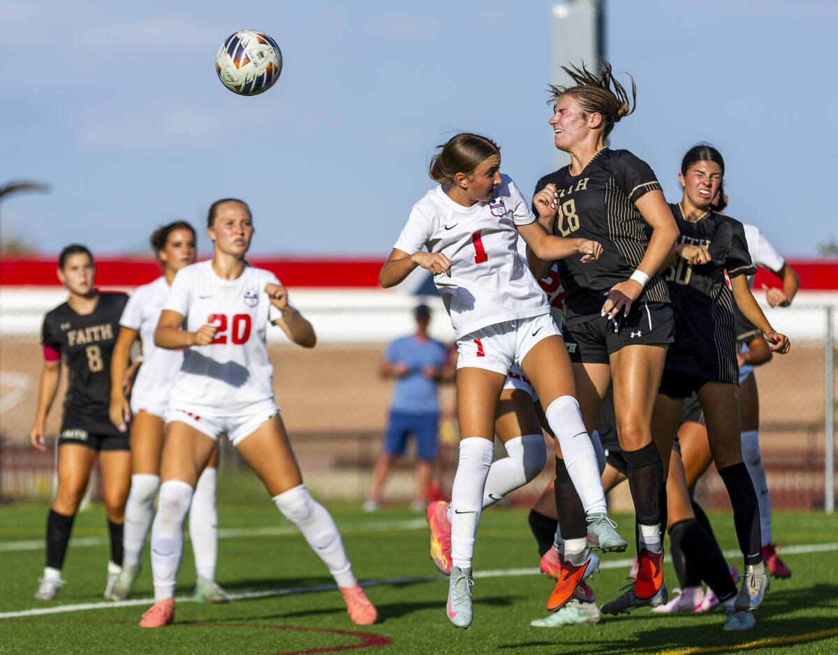 Faith Lutheran forward Allie Rabe (28) heads the ball away from Coronado midfielder Taytum Arens (1) attempting to score during the second half of their NIAA girls soccer game on Tuesday, August 26, 2025, in Las Vegas. (L.E. Baskow/Las Vegas Review-Journal) @Left_Eye_Images