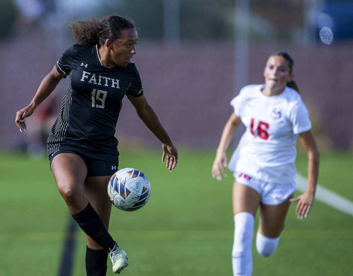 Faith Lutheran forward Briana Lee (19) advances the ball as Coronado defender Mia Schlachter (16) moves in during the first half of their NIAA girls soccer game on Tuesday, August 26, 2025, in Las Vegas. (L.E. Baskow/Las Vegas Review-Journal) @Left_Eye_Images
