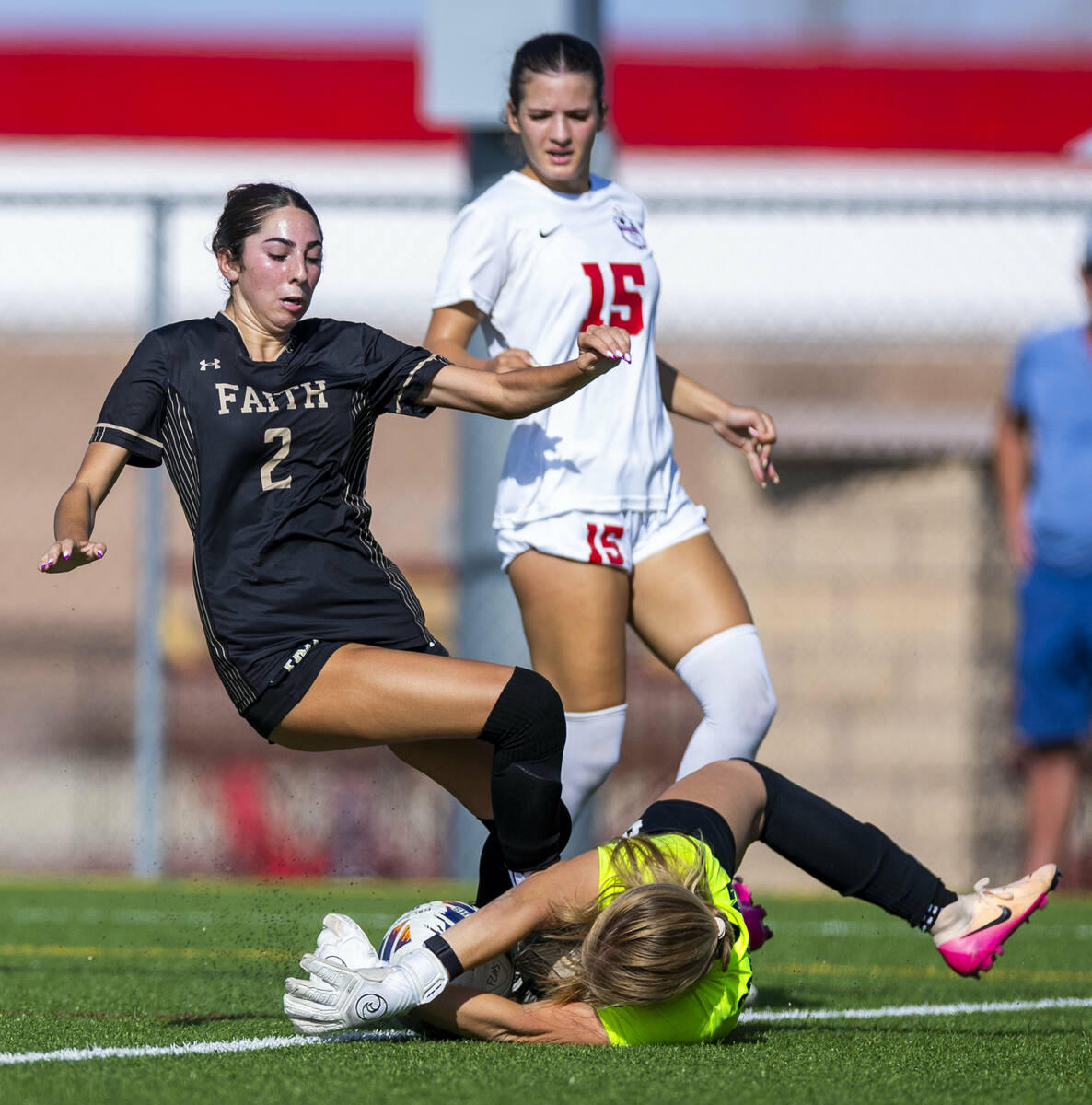 Faith Lutheran forward Elliott Lujan (2) has a shot smothered by Coronado goalkeeper Liliana Foss (0) during the first half of their NIAA girls soccer game on Tuesday, August 26, 2025, in Las Vegas. (L.E. Baskow/Las Vegas Review-Journal) @Left_Eye_Images