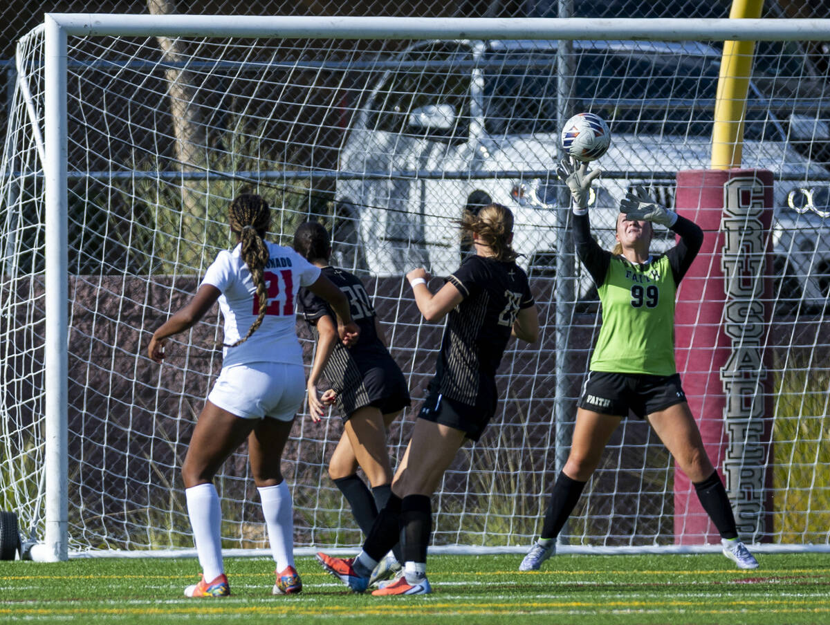 Faith Lutheran goalkeeper Olivia Petty (99) deflects a Coronado kick denying a score during the first half of their NIAA girls soccer game on Tuesday, August 26, 2025, in Las Vegas. (L.E. Baskow/Las Vegas Review-Journal) @Left_Eye_Images